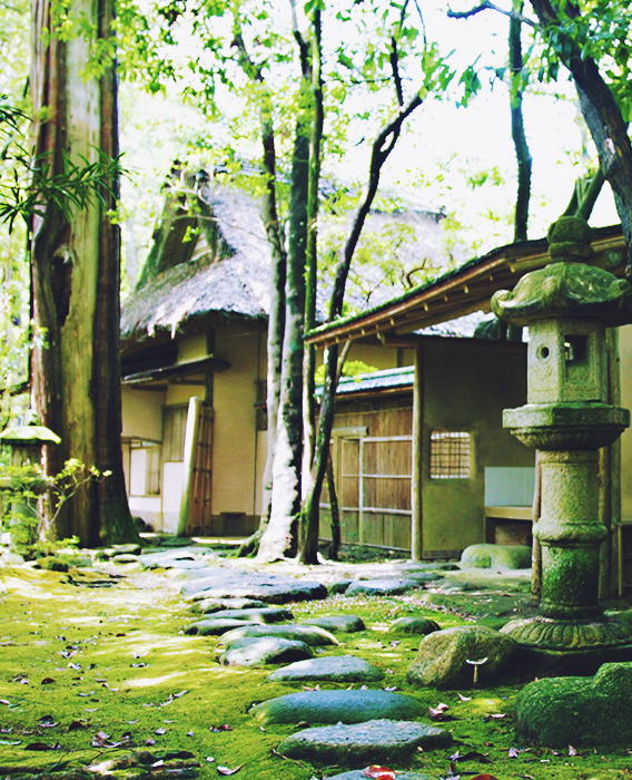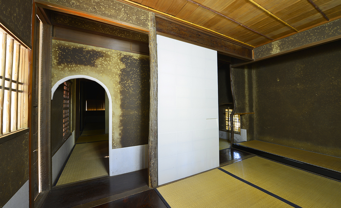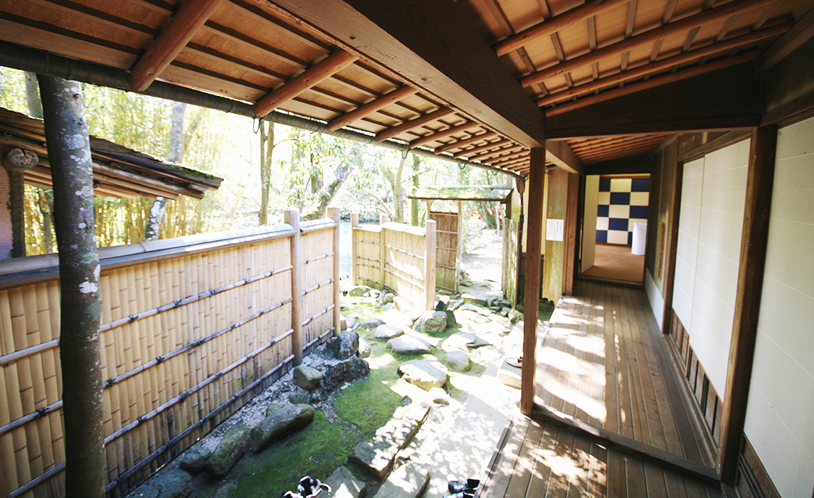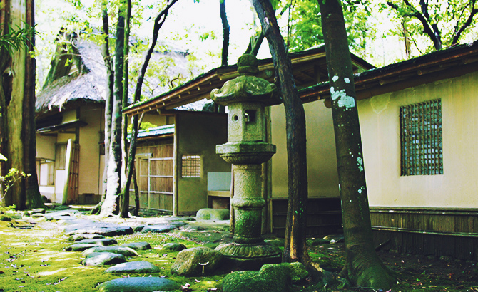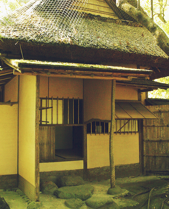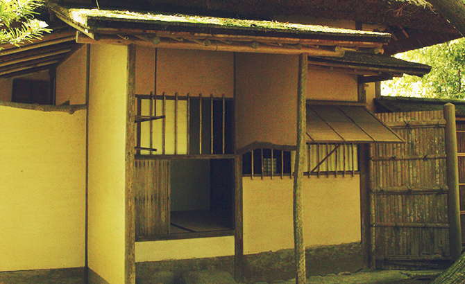 古い六地蔵石幢を火袋に使った珍しい石灯籠の横を通って進みますと、池の縁に蹲踞(つくばい)の手水鉢(ちょうずばち)があるので、そこで手を洗って、飛石をつたってお茶席に向かいましょう。左手の水際に金明竹の群生があります。黄色の軸に緑の斑が入った竹で、この庭の一つの名物です。 安楽庵は茅葺屋根の瀟洒(しょうしゃ)な建物で、踏石の左上に刀掛の棚があります。むかし武士はここへ刀を掛けて入りました。入口はいわゆる「にじり口」で、60センチ四方ほどの狭いところからにじりよって入ります。お席は畳が二畳半で、それに鱗板(うろこいた)と言って、二種類の木を三角形に切って矧ぎ合わせた板が半畳分入っていて、合わせて三畳の小さい部屋です。この鱗板というのは、織田信長の末弟で茶人だった有楽齋長益(うらくさいながます)の好みだった、といいます。またこのお茶席は中央に白い太鼓張りの襖があって、客席と亭主席との間仕切りになっているのが大きな特徴です。これは千利休の長男道安が、足が不自由だったので、茶道具を運ばせ終ってからこの襖を開いて点前(てまえ)をしたためだ、と言われていて、この形式を道安囲(どうあんがこい)と言います。このように道安と有楽齋の二人の高名な茶人の工夫が中心になった茶席なので「安楽庵」という名がついたようです。茶道の「佗びと寂び」を味わって下さい。(平松) 安楽庵パンフレットより