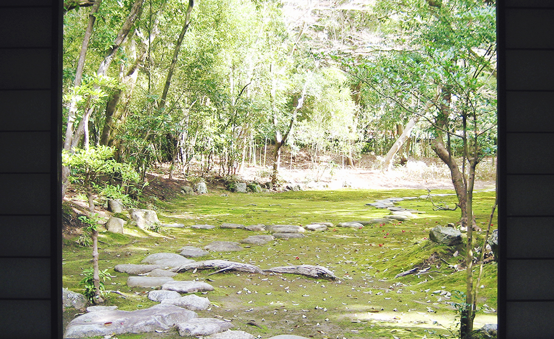 両御堂の裏側一帯10,750平方メートル(3,250坪)は庭園になっています。正式には「雲幽園」と名づけられているのですが、一般にはお茶席の名をとって「安楽庵の庭」と呼ばれています。 池をめぐって歩く廻遊式庭園で、入口から右へ、竹籔の中の間の苔むした道を進むと、茅葺の門があります。「雀の御宿」へ来たような気分です。門をくぐると、大きな短冊型の延べ石二枚が橋になっていて、そこから飛石づたいに進みます。道が二つに分かれるところに、古風な釣瓶(つるべ)井戸があります。むかし茶席の席の水はここで汲んだのだそうです。 そこから右手に進むと、杉苔が草むした広いお庭で、向こうに安楽庵の書院が見えて、静寂そのものです。道を左手にとると、潜り門があって、そこからが内露地です。砂雪隠や待合があって、茶席へつづくあたりは右の配置一つにも趣向が凝らされていて、この庭の大きなポイントです。 樹の間がくれに見る中の島も風情があります。水際にも石組を全く使わない州浜型(すはまがた)です。言わば自然のままの姿です。 安楽庵パンフレットより