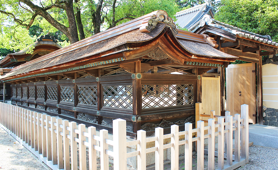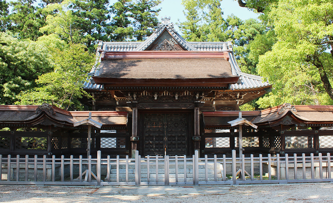 拝堂は屋根の正面と背面に大きな千鳥破風、正面の軒に唐破風をつけて、やや大仰な外観を示すが、内部は構造材を露出させたブッキラボウな感じの建物になっている。唐門、瑞垣、拝堂とも幕末の建造であって、拝堂の瓦に安政5年(1858)の銘がある。