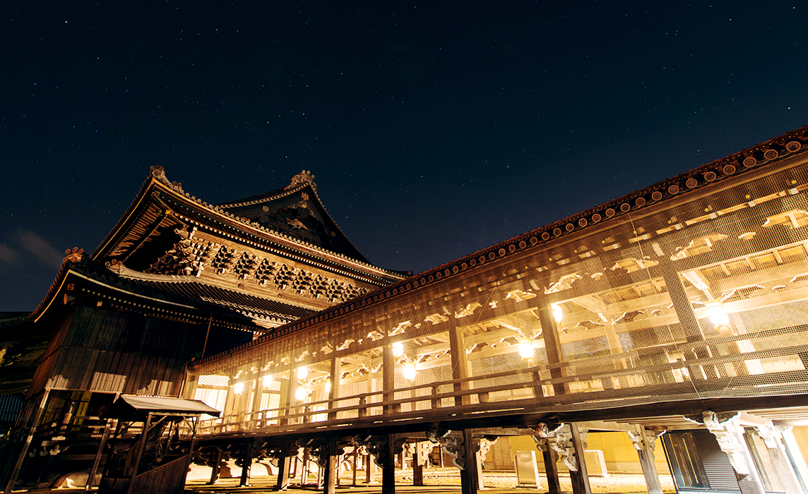 御影堂と如来堂を結ぶ通天とよばれる橋です。両御堂の縁側にかかっているため高床とし、板張りで、柱間はすべて吹抜けになっています。柱の外側に床と同じ高さの縁側をとりつけ、その端に高欄を置いている。床下は柱に三手先の挿肘木を挿し込んで、この縁側を受けている。屋根はいわゆる「照り起(むく)り」で、両端に唐破風をつける。天上のあたりには細部に彫物を多用し、同一部材でも彫物の図柄や形に変化を持たせ、建物の単調さを防ごうとする工夫が凝らされている。