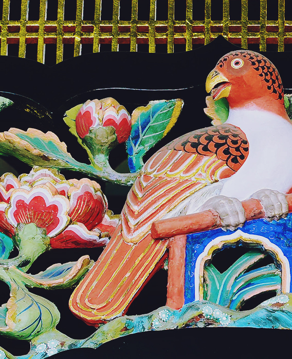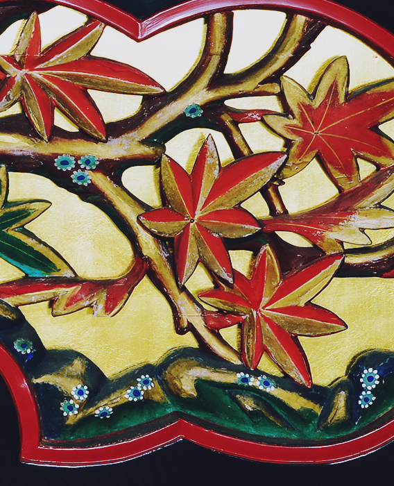 建築様式は純和様であって、質素ではありますが落ち着いた外観を醸し出しております。妻飾りは標準的な二重虹梁組みで、垂れ下がっている懸魚も典型的な三つ花懸魚で、手堅い細工が見事な出来栄えです。妻廻り全体を銅板張りとして、破風板に金色に輝く五七桐紋の金具を貼りつけ、落ち着いた重厚感を感じます。軒丸瓦の向拝を身舎に繋ぐ虹梁の上に笈形のついた太瓶束をのせ、その上から身舎へ海老虹梁で繋ぐという架構は、江戸幕府御用大工が好んで用いた架構でした。これらの手法により、このお堂の棟梁と江戸幕府との関係が推測されます。内部の間取りは真宗寺院としてほぼ通規ですが、本願寺系の本堂と異なる点は、大間が横長になっていることと、両余間の床が奥寄りのところで一段高くなっていることで、これらが各末寺に影響を与えたようで、この後の高田派寺院建築の特徴となりました。