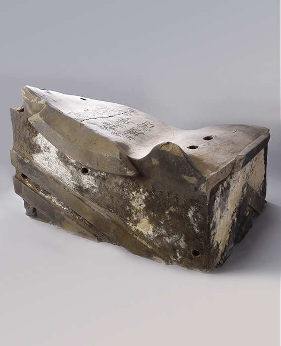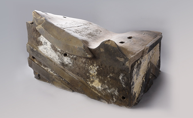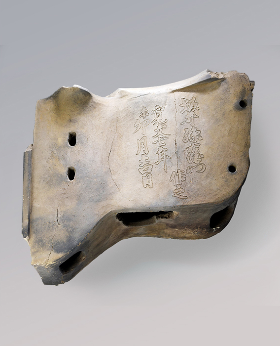 御影堂の大棟に建立時に据えられていた獅子口の一部。御影堂の建立年時を明らかにする「寛文7年卯月吉日」のヘラ書が記されています。建立当時の姿を伝える重要な資料です。