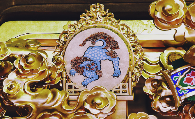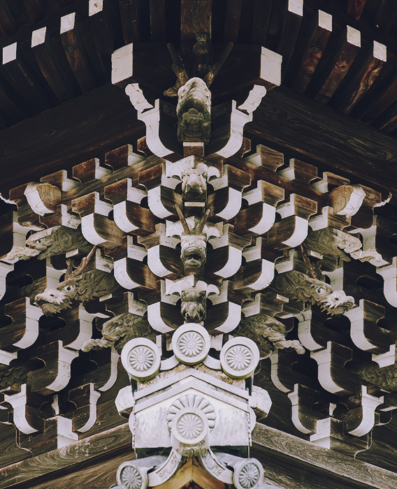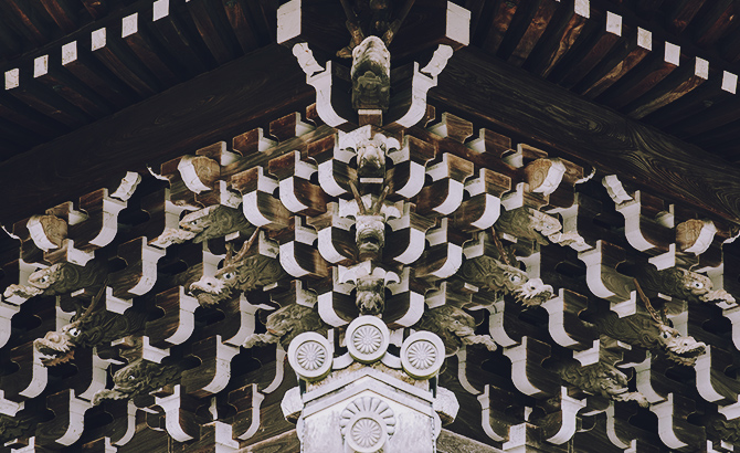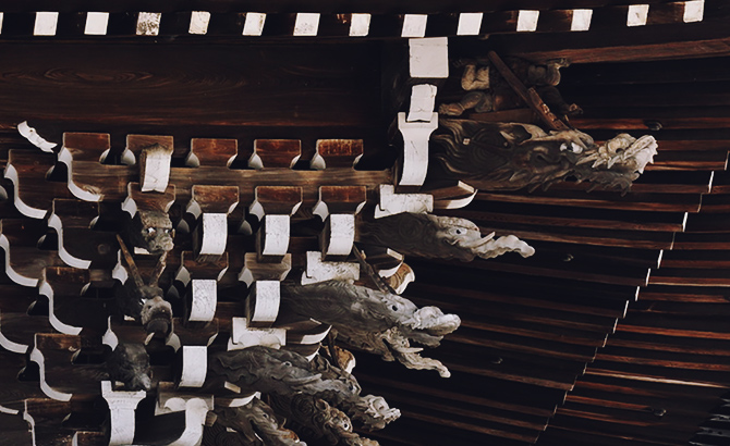 建築面積は御影堂に比べるとおよそ半分程ですが、阿弥陀如来の仏殿にふさわしい華麗な建築となっております。屋根を二層として、棟の高さを御影堂とほぼ等しくしているのも、本堂としての威容を示すためだと伺えます。このため外観は二階建てであるかのように見えますが、二階があるわけではなく、下層の屋根は裳階と呼ばれる三種の庇となっております。上層の屋根の軒の組み方を見ると、垂木は二股で、それが扇形になっていて、それを四手先という複雑な組み物で受けています。これらの軒組みは、柱と柱の間にも置かれている、いわゆる″詰組″で、完全に禅宗様(唐様)という建築手法によって建立されていることがわかります。また尾垂木という部材の先端を象・龍・獏の彫刻としたり、下層のかえる蟇股には中国の故事に基づいた人物の彫刻が組み入れたりしていて、実に手の込んだ精巧な建築物となっております。