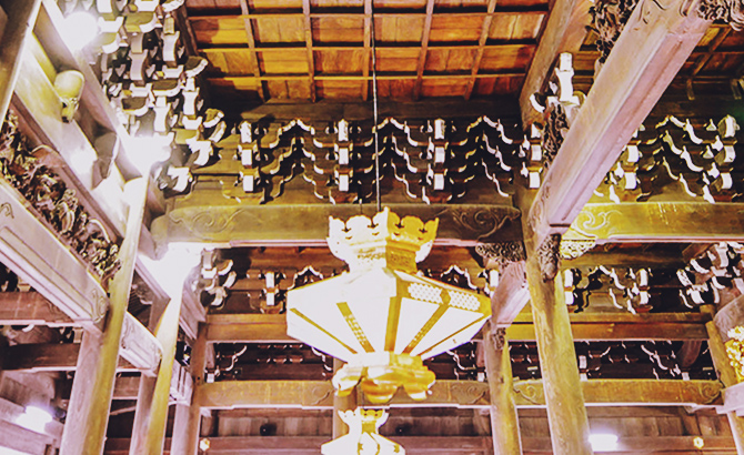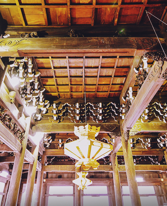 その真偽を確かめる史料は現存しておりませんが、その柱付近の地盤が最も軟弱であったことは、先年のボーリング調査によって確認されております。上棟は延享元年(1744)3月24日、落成遷仏は寛延元年(1748)7月18日、棟梁は近江八幡の高木但馬、脇棟梁は白塚の長谷川十右衛門と浜田の村田喜太郎と伝えられております。この如来堂ですが、昭和58年(1983)から七年半の歳月と総工費十四億八千万円をかけて大修理工事が実施され、平成2年(1990)3月に修繕工事が完成しました。