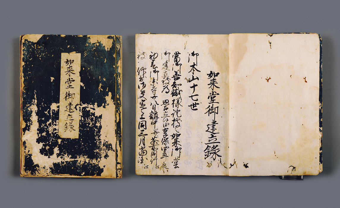 御影堂が巨大な空間の建築物であるのに対して、如来堂は質的に高度な建築物とも評されております。この造営については、『如来堂御建立録』(高木家旧蔵)や修理工事によって発見された墨書銘などの史料などによってその経過を知ることができます。それら書物によると、発願は享保4年(1719)、着工は翌々6年で、資金難から工事が渋滞し、ようやく元文5年(1740)から地築にかかっています。しかし、地盤が軟弱なために寛保3年(1743)8月まで満三ヵ年を要しました。東南隅の礎石にある刻銘は、このとき勘六という老人が人柱に立った記念と言われております。